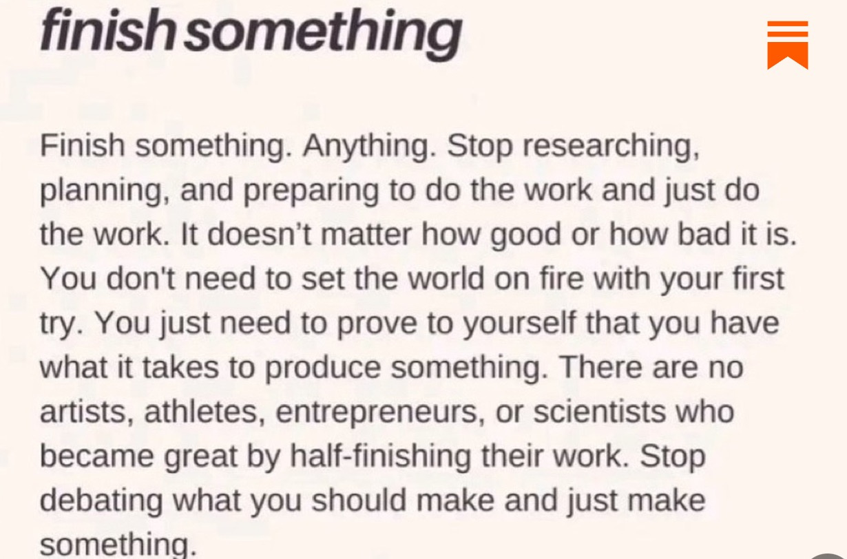 I saved a screenshot this year that says: “Finish something. Anything. Stop researching, planning, and preparing to do the work and just do the work.”
